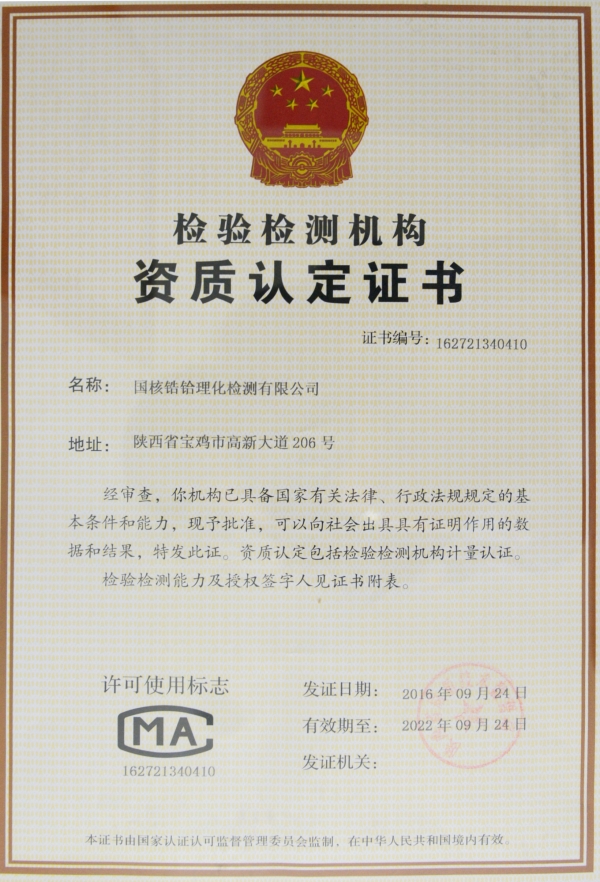 國(guó)核鋯業(yè)所屬國(guó)核鋯鉿理化檢測(cè)有限公司檢驗(yàn)檢測(cè)機(jī)構(gòu)資質(zhì)認(rèn)定證書(shū)