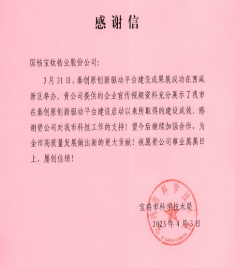 近日,公司收到一封來自寶雞市科學技術局的感謝信,充分肯定了公司在“秦創原創新驅動平臺”建設成果方面做出的努力。