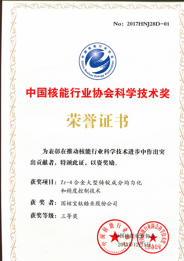 國核寶鈦鋯業股份公司《Zr-4合金大型鑄錠成分均勻化和精度控制技術》項目獲中國核能行業協會2017年度科學技術獎三等獎