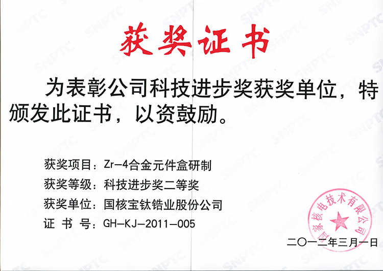 國核寶鈦鋯業股份公司《Zr-4合金元件盒研制》獲2011年度國家核電技術公司科技進步二等獎