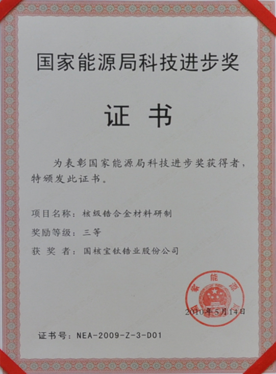 國(guó)核寶鈦鋯業(yè)股份公司《核級(jí)鋯合金材料研制》獲2009年度國(guó)家能源局科技進(jìn)步三等獎(jiǎng)