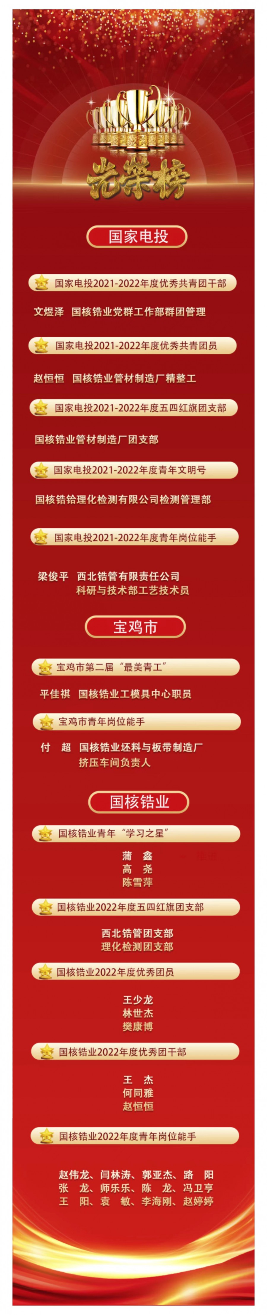 今年五四青年節(jié),國核鋯業(yè)共有2個集體和3名個人獲得集團公司級榮譽;2名個人獲得寶雞市級榮譽;21名個人和2個集體獲得公司級榮譽。讓我們向榜樣學習、向青春致敬。